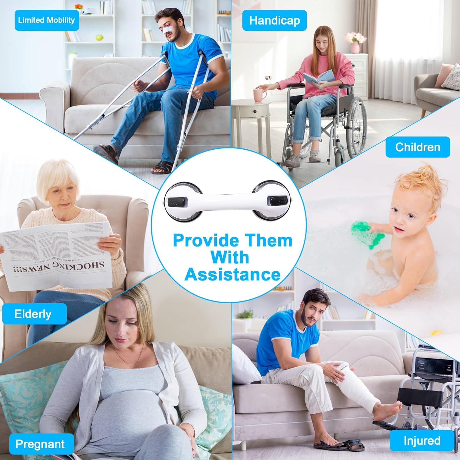 - COMPARTABLE AND MOBILITY SUPPORT: Due to Portable grab rails for bathroom support safety strong suction cups and comfortable non-slip grip grab handle. Useful for bath, shower and toilet disability aids and mobility aids, no tools or drilling required.